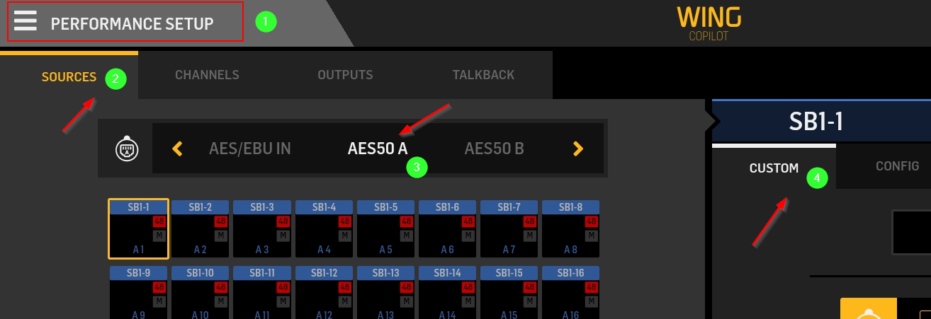 ![]() | 1) Kies scherm “Performance setup” in de grijze balk links bovenin beeld. Ben je op een ander scherm? Klik dan op de 3 witte strepen links bovenin beeld. 2) Kies tabblad “Sources”. 3) Kies de juiste ingang op de mengtafel. Deze lijst kun je naar links en naar rechts schuiven. SB1 en SB3 hangen standaard aan “AES50 A”, SB2 aan “AES50 B” en SB4 (bij de lichtregie) aan “AES50 C”. Zie ook: Stageboxen en aansluitingen 4) Zorg dat aan de rechter kant van het scherm tabblad “Custom” is geselecteerd. |